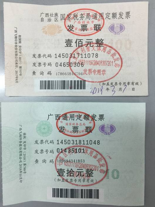 根据《国家税务总局关于税务机构改革有关事项的公告》(国家税务总局2018年第32号公告)规定,国家税务总局广西壮族自治区税务局已启用新版普通发票,新版普通发票监制章为椭圆形,内环加刻一细线,上环刻制“全国统一发票监制章”字样,中间刻制“国家税务总局”字样,下环刻制“广西壮族自治区税务局”字样。启用新版普通发票监制章时,广西壮族自治区税务局监制的普通发票名称统一调整为“广西通用机打发票”“广西通用手工发票”“广西通用定额发票”“机动车销售统一发票”“二手车销售统一发票”。