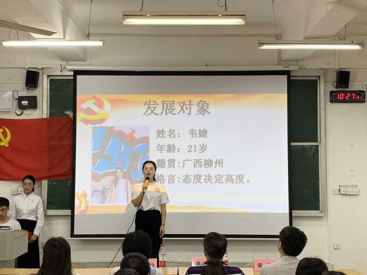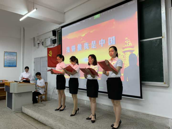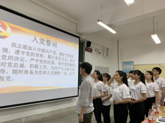 党员大会在庄严昂扬的国际歌中拉开序幕。首先由主持人阙盛彬同志按照会议进程清点到会人数,并宣读符合召开支部大会的要求。随后严格按照党员发展、转正流程,分别对张欣怡等八位同志发展为预备党员及黄立嘉等四位同志按期转为正式党员问题进行讨论审议,拥有表决权的正式党员进行无记名投票,均全票通过张欣怡等八位同志成为预备党员,黄立嘉等四位同志按期转为正式党员。最后,本次发展的八位预备党员面向党旗庄严宣誓、接受并佩戴了颁发的党徽。