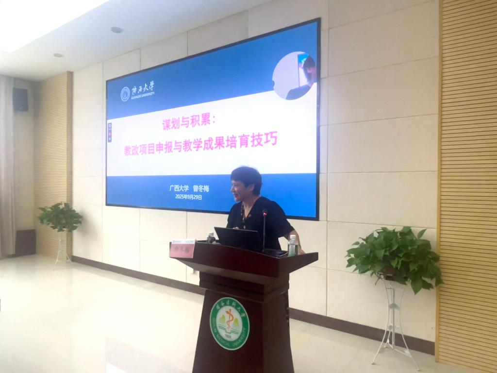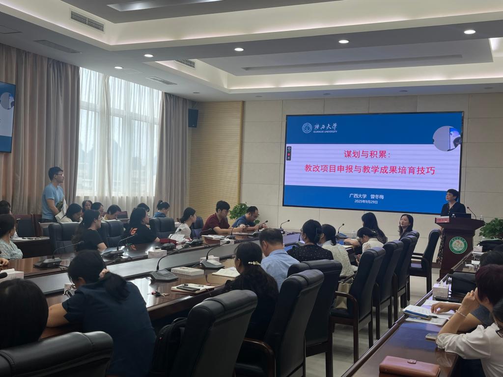 9月29日上午,我校在明德楼502会议室开展“特色一流本科”大家讲坛,特邀广西大学行健文理学院院长曾冬梅教授作《谋划与积累:教改项目申报与教学成果培育技巧》专题报告。各学院教学负责人、拟申报2025年校级教改课题的教师及相关管理人员近百余人参加了此次学习。
