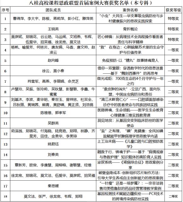 近日,八桂高校课程思政联盟首届课程思政优秀案例评选结果揭晓。我校教师团队在此次大赛中表现出色,从629项参赛案例中脱颖而出,荣获特等奖3项、一等奖4项、二等奖11项,充分展现了我校在课程思政建设中扎实的工作基础与显著的育人成效。