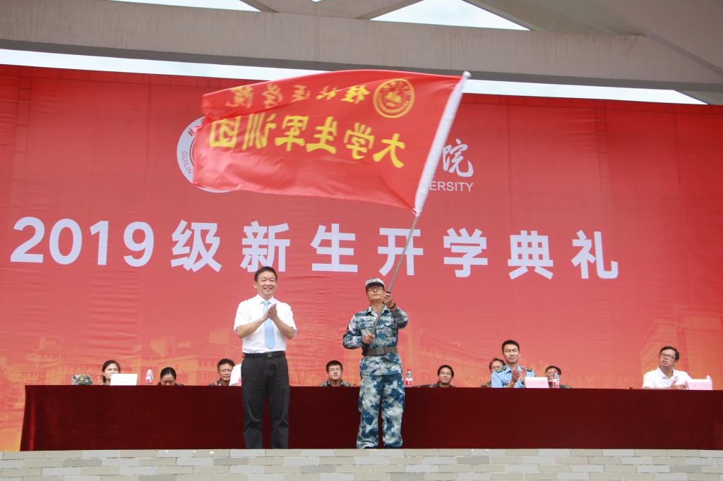 随后,齐俊斌作了开训动员讲话并为2019级大学生军训团授旗,他说大学生参加军训是认真贯彻落实《国防法》、《兵役法》的重要举措。大学生参加军训是培养全面发展的社会主义事业建设者和接班人的重要途径。青年是祖国的未来和希望。肩负着振兴中华、保卫和建设祖国的重任。为了使全体参训学生更好地完成这次军训任务,他对同学们提出四点要求和希望:一是要把军训作为大学生活的新起点;二是要严格要求,刻苦训练;三是要尊敬教官,虚心学习;四是团结友爱,互相帮助,共同进步
