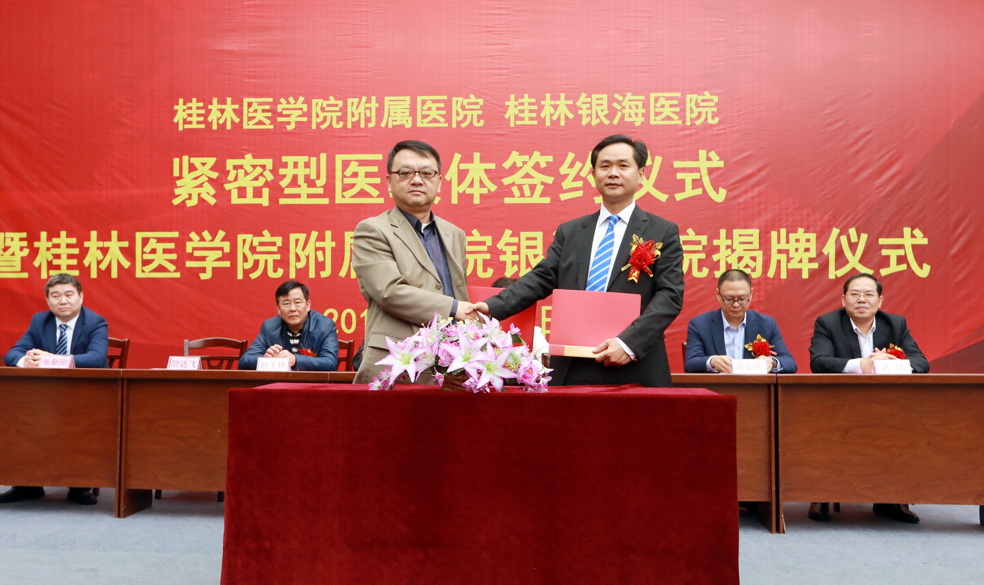 桂林市卫健委党组成员李钟江,桂林市卫生计生监督所所长赵玉林,桂林医学院附属医院党委书记文琼仙、院长李清华、副书记蒋尧传、副院长蒋伟,桂林银海医院董事长尉达飞、院长张新刚,以及两院相关科室、部门负责人等出席签约和揭牌仪式。