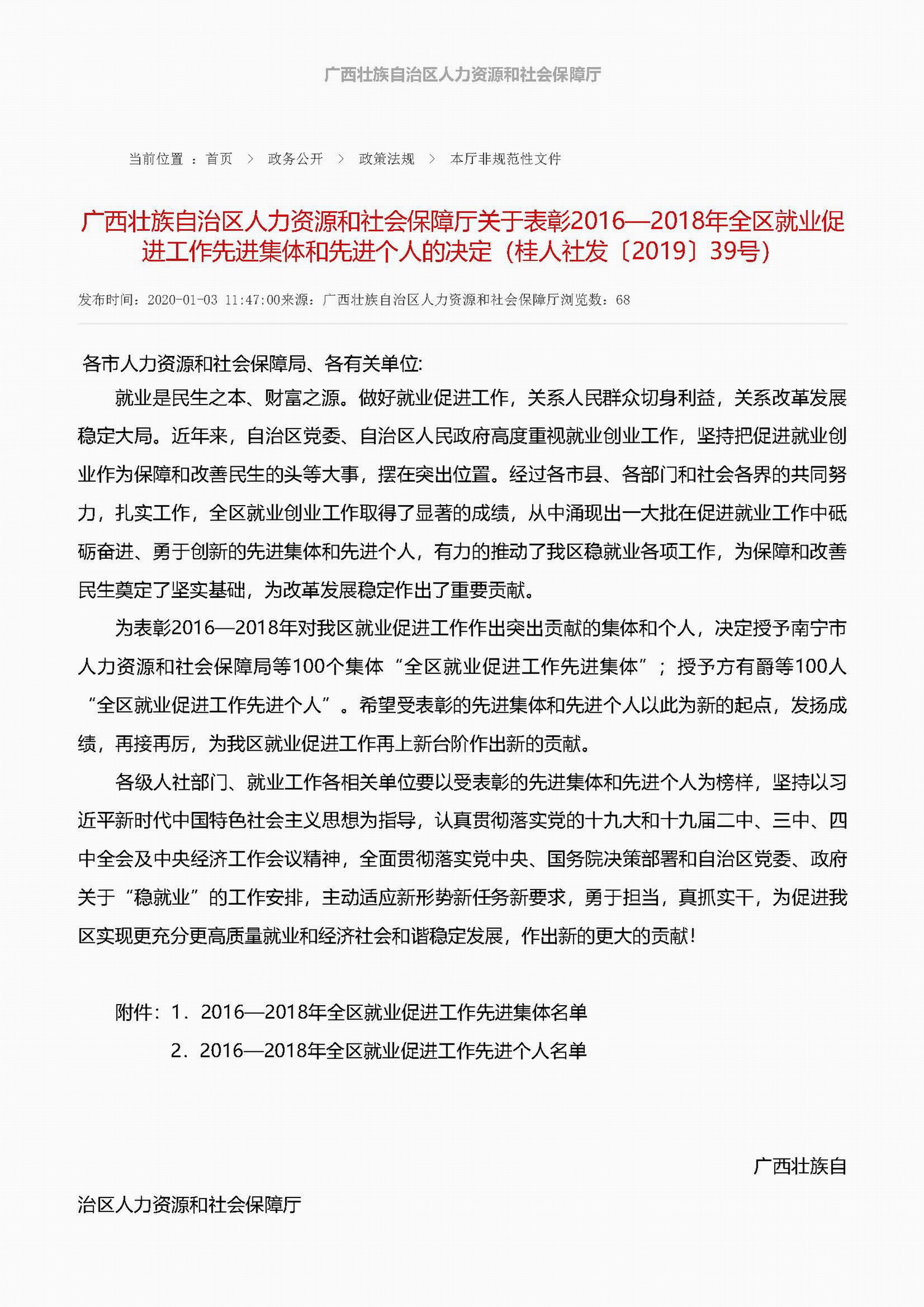 根据《广西壮族人力资源和社会保障厅关于开展全区就业促进工作先进集体和先进个人表彰活动的通知》(桂人社函【2019】184号)文件精神,经过各地各部门推荐、材料审核、集体研究等程序,我校招生就业处荣获全区就业促进工作先进集体,在这次评比中,全区只有五所普通高校获得以上殊荣,我校也是唯一一所医学院校获得此项荣誉。