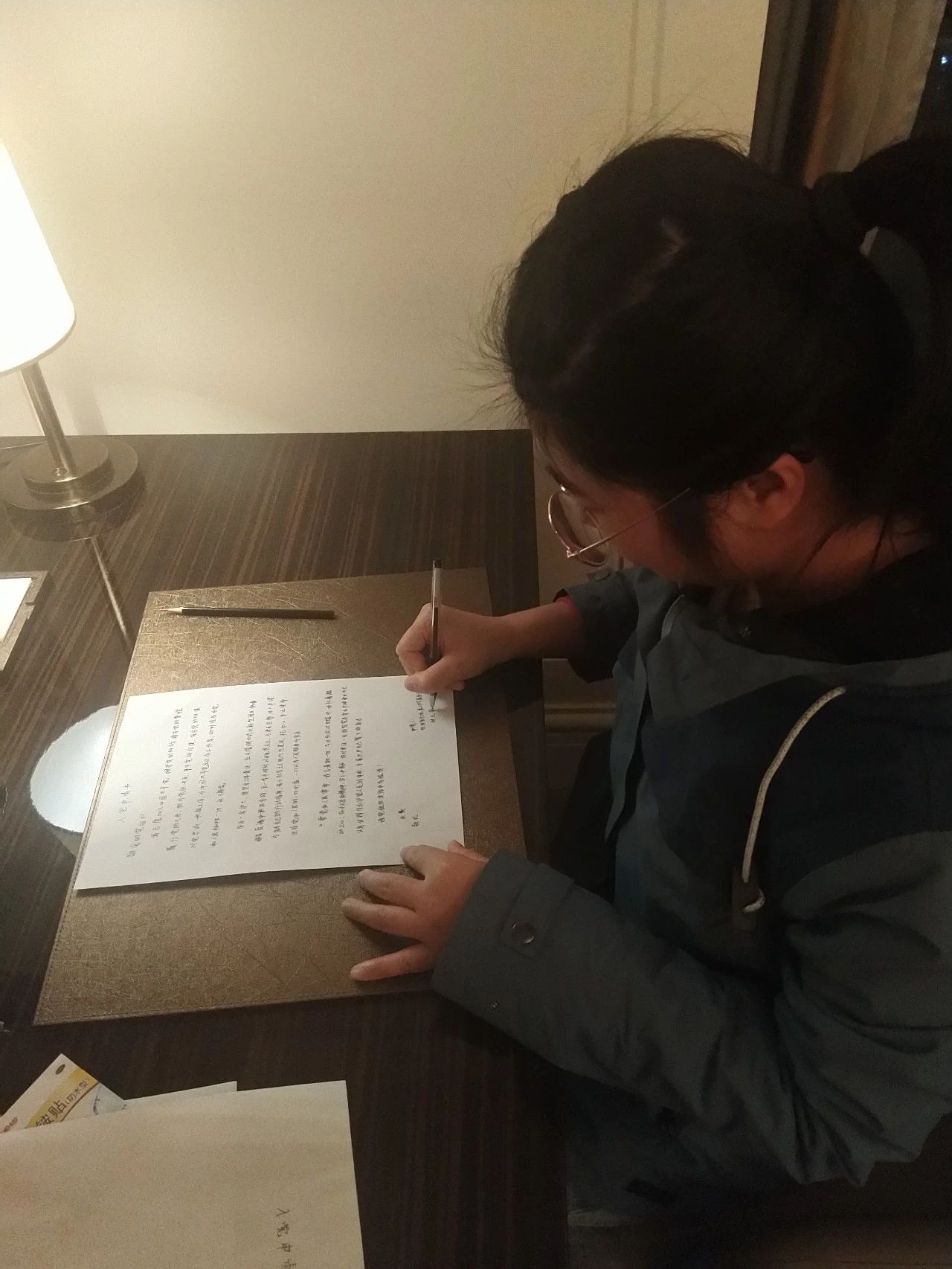 医疗队员张玉荣正在写入党申请书