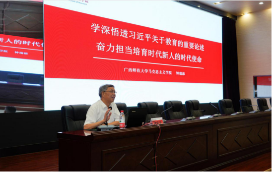 9月22日-24日广西师范大学原副校长钟瑞添、我校纪委书记谢忠文、华东师范大学博士生导师胡伟、广西区委党校原副校长陈林杰、我校统战部部长李海林、桂林市委党校党建教研室主任李霄冰分别作专题辅导报告,报告深入浅出、内涵丰富、思想深刻、分析透彻,深受学员们的欢迎。