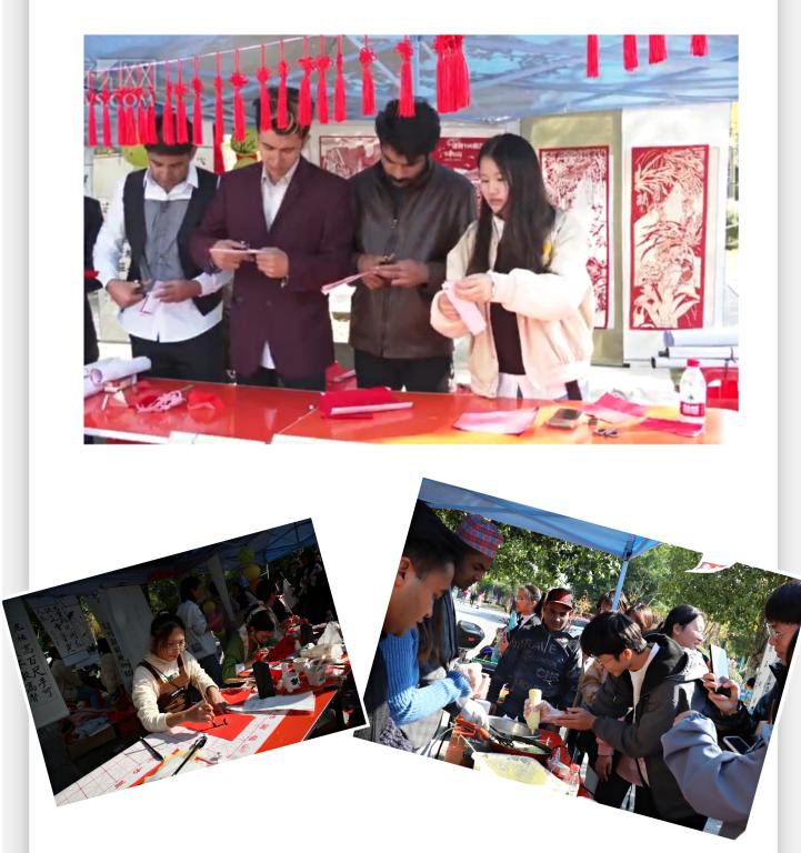 本届国际文化节还举办了“中外优秀文化及美食展”。中外学子通过亲身体验剪纸、书画、汉服等民间艺术,深刻体会了中华文化的魅力;留学生们还与到场人员制作共享了多国美食。