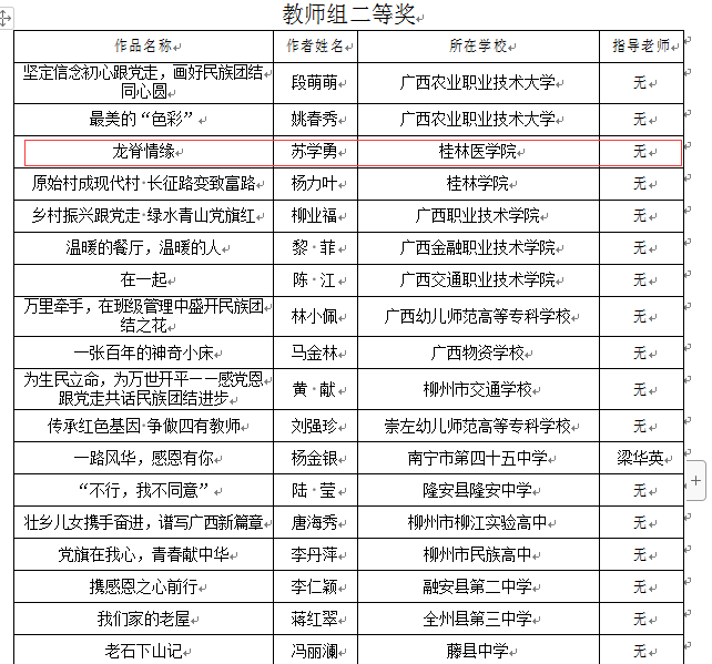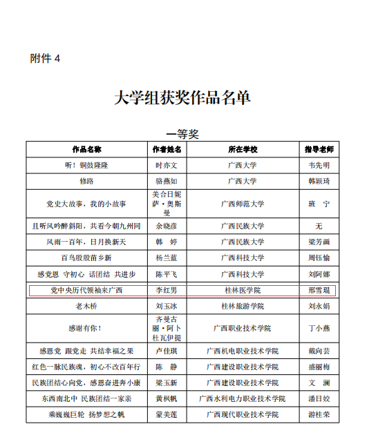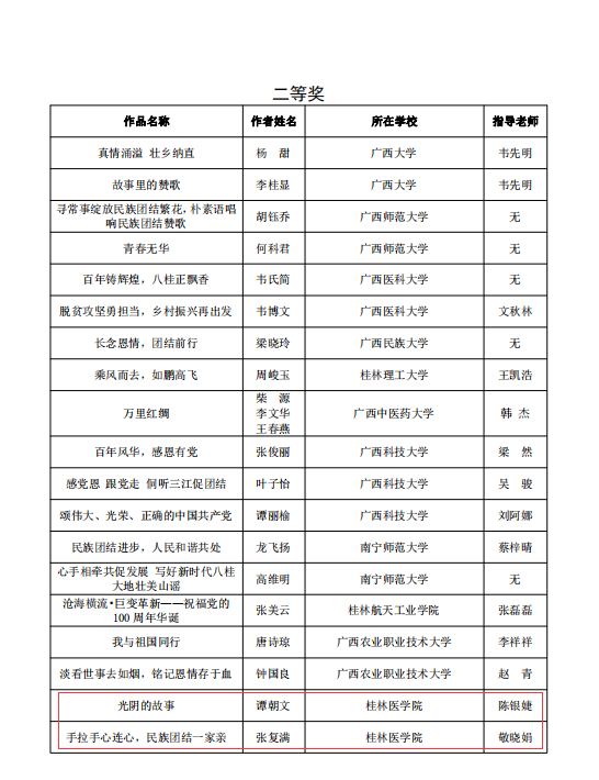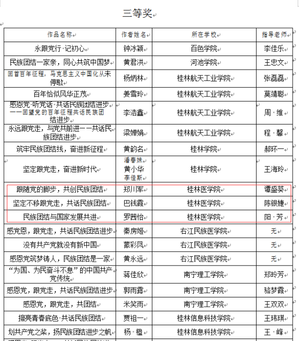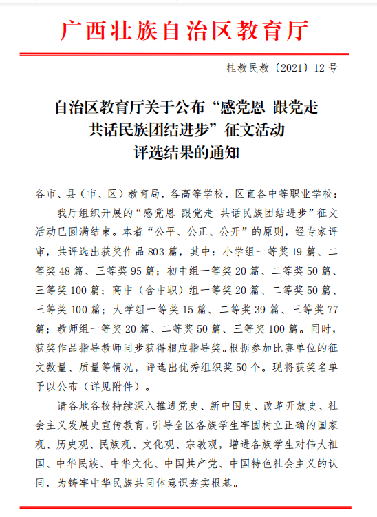根据《自治区教育厅办公室关于组织开展“感党恩 跟党走共话民族团结进步”征文活动的通知》,我校共选送了12篇作品(学生组7篇,教师组5篇)参加活动。其中:我校学生李红男的作品《党中央历代领袖来广西》获得大学组一等奖;谭朝文等5名同学的作品分别获二、三等奖;教职工苏学勇的作品《龙脊情缘》获得教师组二等奖;同时我校也获得了“优秀组织奖”的好成绩。