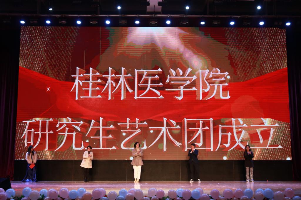 晚会上,副院长陈旭、研究生工作部、研究生学院老师、研究生代表共同启动按钮,宣布桂林医学院研究生艺术团成立。艺术团的成立,将进一步丰富研究生学术文化生活,增添美育浸润下的研究生科研力量,为培养德智体美劳全面发展的医学人才奠定基础。