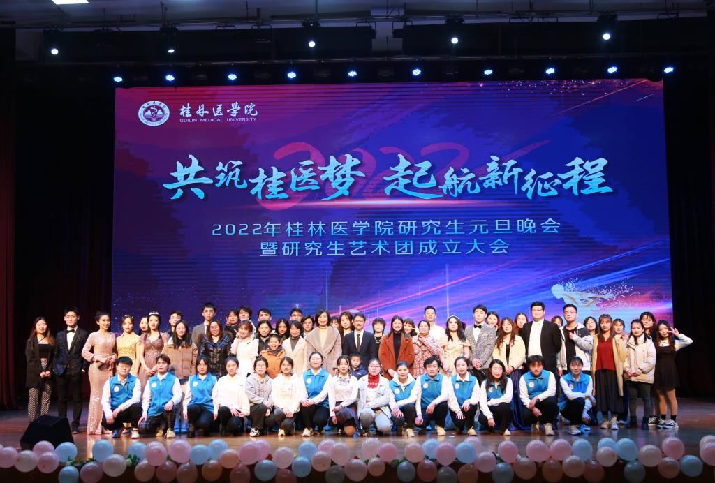 为庆祝元旦喜迎新年,1月3日晚研究生学院在临桂校区大学生活动中心四楼演艺厅举办2022年桂林医学院研究生“共筑桂医梦,起航新征程”元旦晚会暨研究生艺术团成立大会,学校党委常委、副院长陈旭出席晚会,研究生学院、研究生工作部全体老师,研究生辅导员及研究生代表欢聚一堂,共庆元旦佳节。