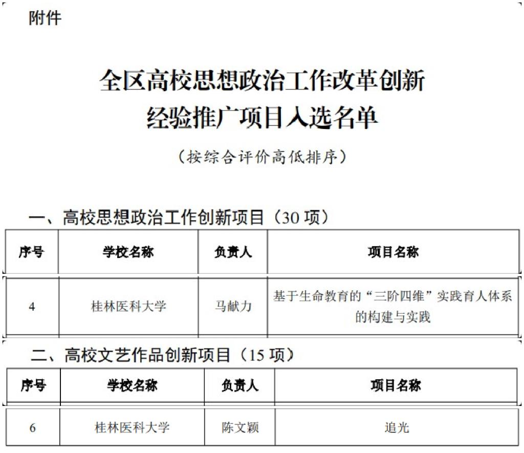 近日,自治区教育厅公布全区高校思想政治工作改革创新经验推广项目入选名单,我校2个项目成功入选。其中,马献力教授主持的《基于生命教育的“三阶四维”实践育人体系的构建与实践》入选高校思想政治工作创新项目;陈文颖老师主持的《追光》入选高校文艺作品创新项目。