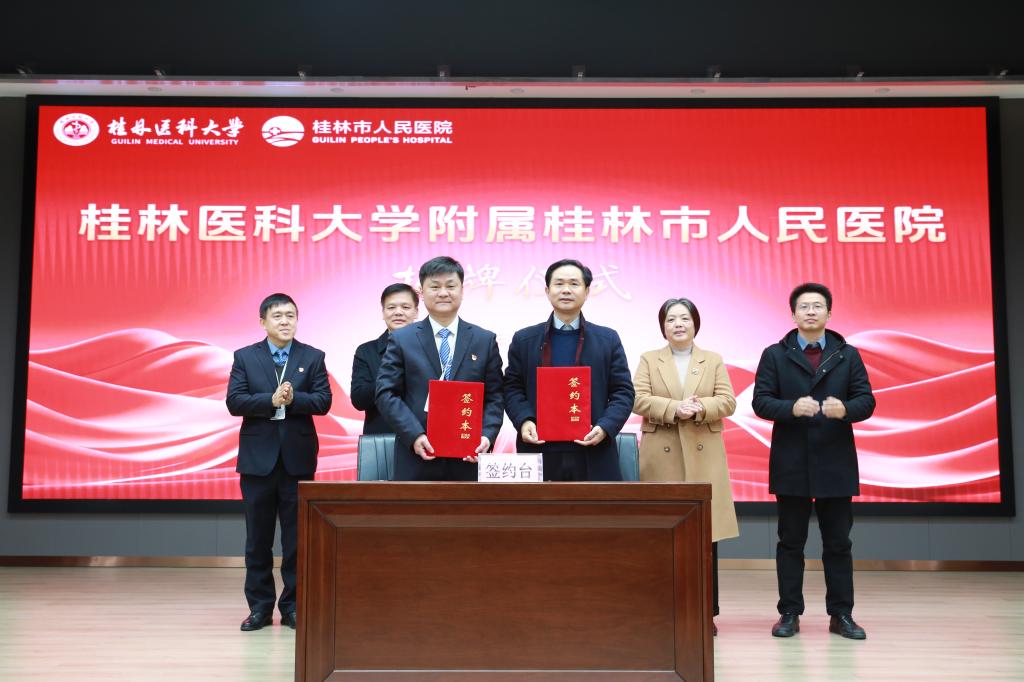 随后,在与会领导嘉宾的共同见证下,李清华与附属桂林市人民医院负责人共同签署《桂林医科大学非直属附属医院合作协议》。双方领导共同为“桂林医科大学附属桂林市人民医院”、“桂林医科大学研究生联合培养基地”揭牌。