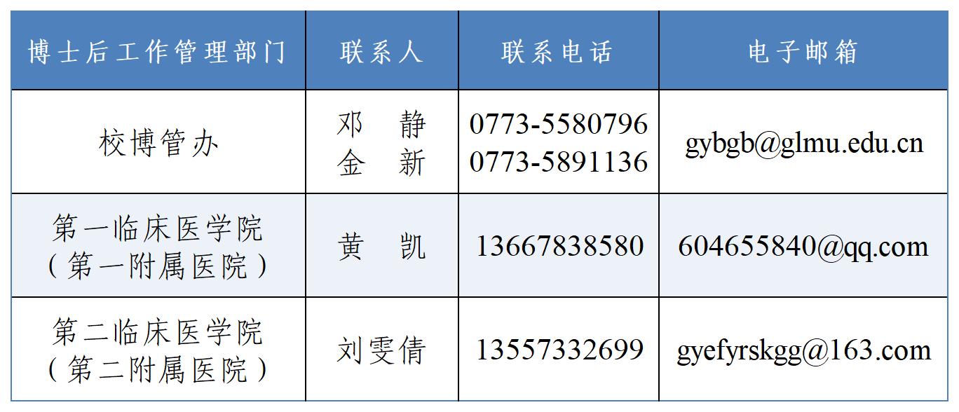 1.本人申请:应聘者可联系有意向的博士后合作导师或学校博管办,详实填写《桂林医科大学博士后岗位应聘登记表》,并将登记表及相应佐证材料发送至相应邮箱。