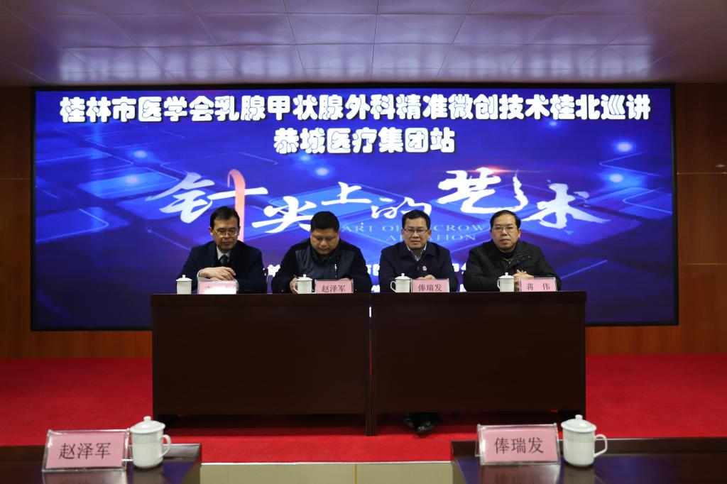 2018年12月29日,由桂林医学会乳甲外科分会、桂林医学院第二附属医院联合主办、恭城县人民医院承办的“针尖上的艺术”乳腺甲状腺外科精准微创技术桂北巡讲—恭城站学术会议在恭城县人民医院学术报告厅隆重召开,约120名恭城县医疗集团下属各个医院的相关专业医护人员参加会议。