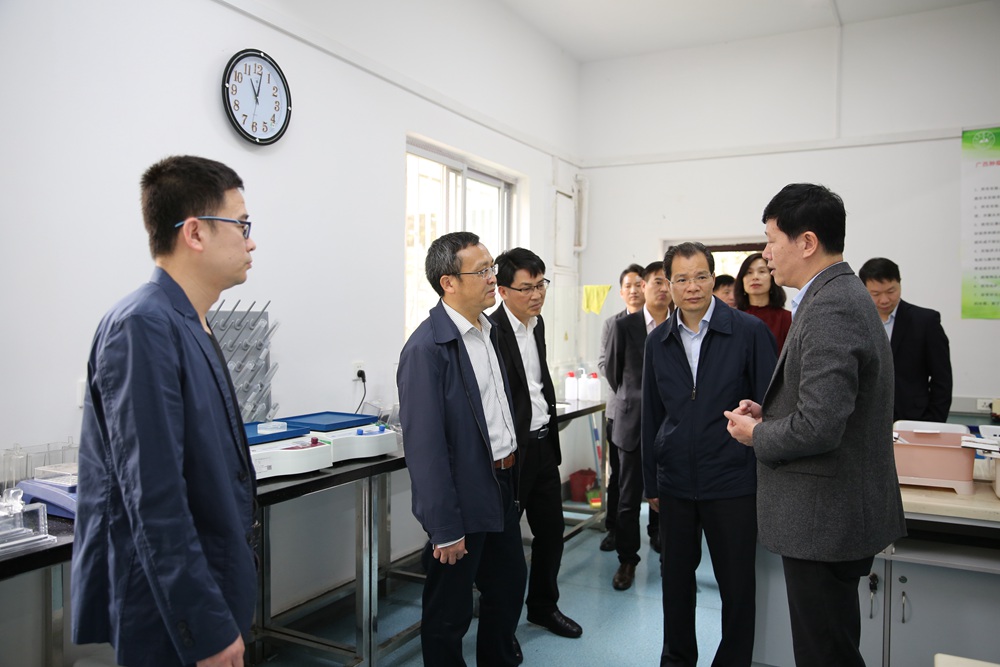 3月21日上午,科技厅唐咸来副厅长带队来我校调研自治区重点实验室建设实施情况,科技厅基础处蒙福贵处长、湛永松副处长以及桂林市科技局黄强局长陪同调研,调研活动在我校东城校区举行。