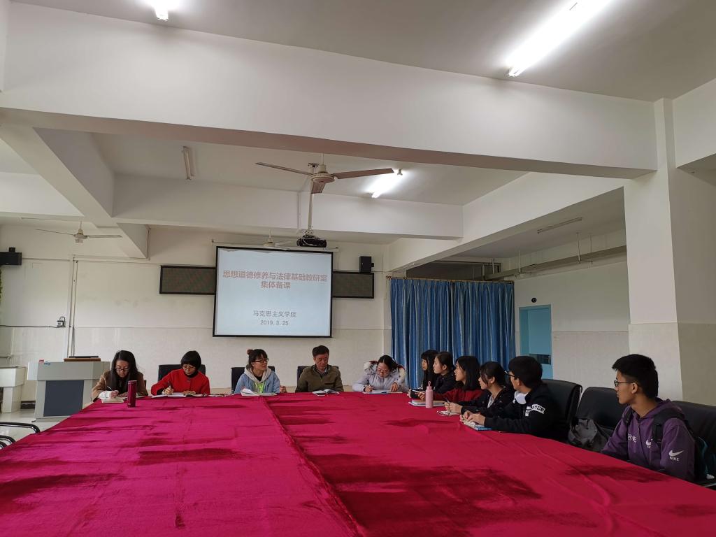 为深入贯彻习近平总书记在学校思想政治理论课教师座谈会上的讲话精神,进一步提高《思想道德修养与法律基础》课程教学质量,2019年3月25日上午,思想道德修养与法律基础教研室在临桂校区人文社科楼三楼培训大厅举行了集体备课会。马克思主义学院院长蒙成光出席会议,教研室全体教师以及2017级、2018级部分学生代表参加会议。会议由教研室主任李武主持。