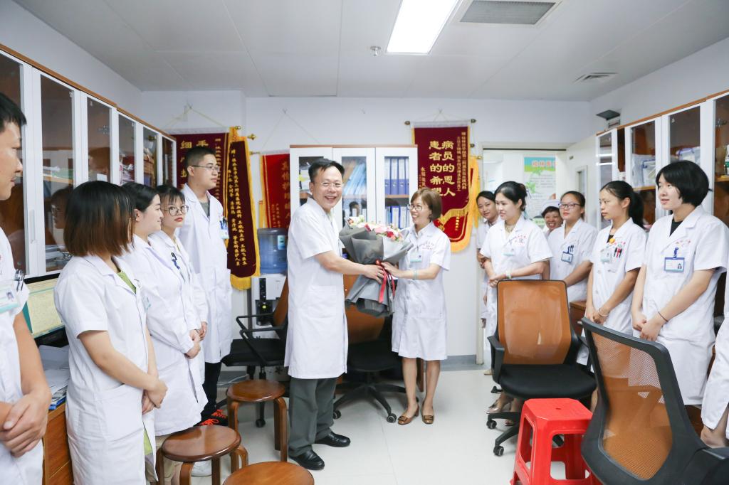 2019年8月19日,在新中国成立70周年之际,迎来了第二个“中国医师节”,为营造尊医重卫的良好氛围,医务部组织了慰问活动。第二附属医院党委书记宋剑非,党委副书记、院长葛波带领班子成员深入各临床科室看望慰问一线工作者,为医生们献上鲜花和蛋糕,送去节日的祝福和亲切的慰问。