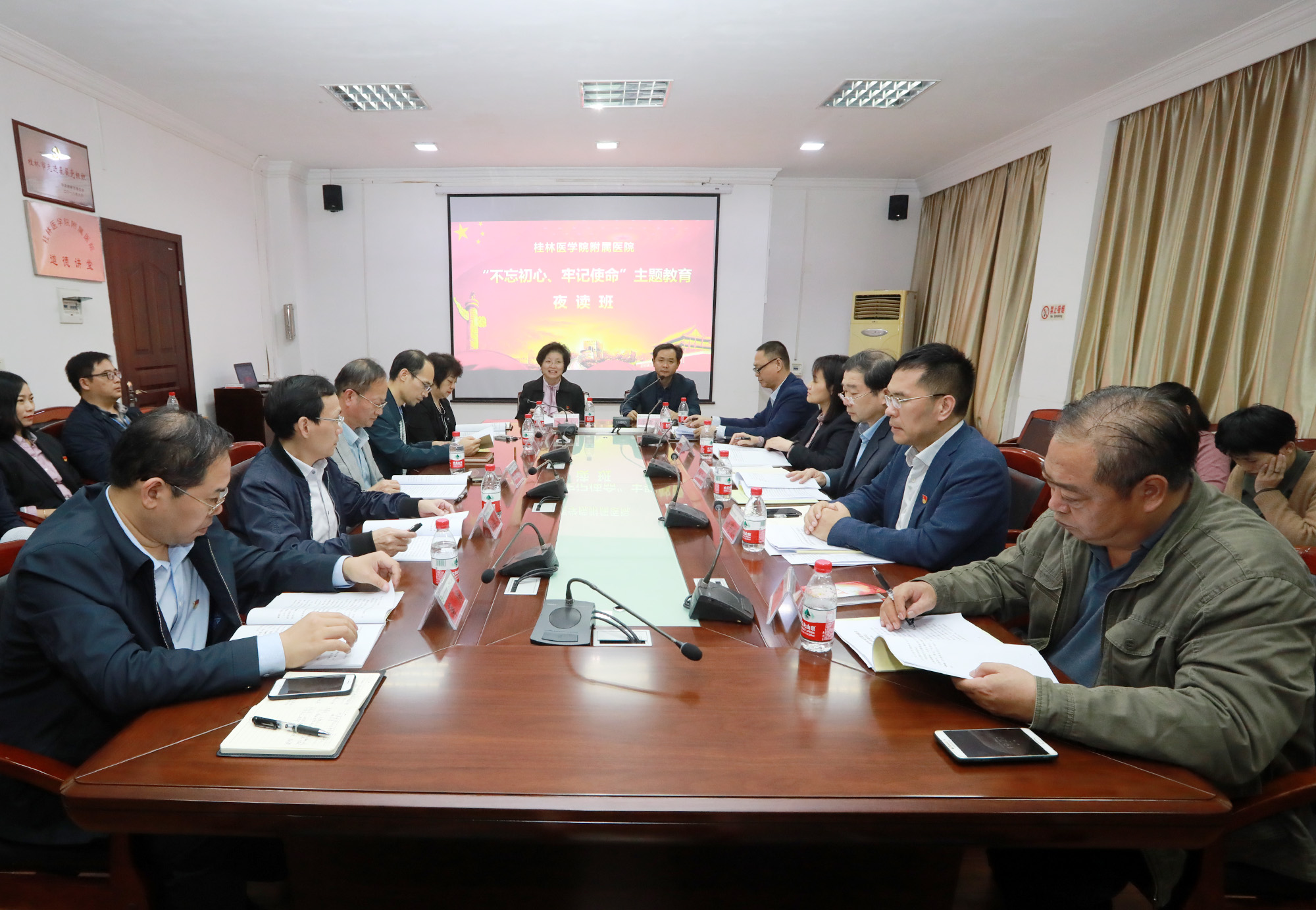 开设夜读班的初衷就是要利用晚上的部分时间,让大家集中起来静下心来读原著、沉下心来学原文、安下心来悟原理。夜读班上,通过分段接力朗读的方式,大家共同学习了《中共桂林医学院附属医院委员会“不忘初心、牢记使命”学习资料(一)》中“习近平关于‘不忘初心、牢记使命’重要论述摘编”。通过学习原文,大家更进一步的了解了共产党人的初心和使命,激励大家干事业要有“船到中流浪更急、人到半山路更陡”的忧患意识,更要有“功成不必在我”的精神境界和“功成必定有我”的历史担当。