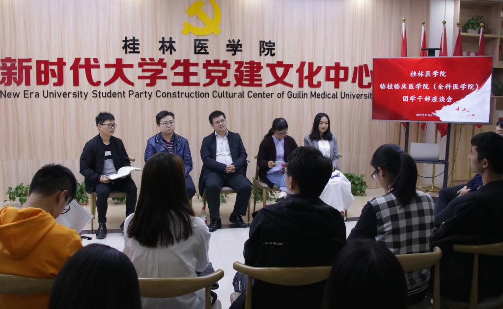 根据中央和自治区党委主题教育工作部署要求,积极响应“不忘初心,牢记使命”的主题教育活动,加强老师与团学干部之间的沟通交流,切实解决学生干部队伍存在的问题,更好地开展我院未来的工作,临桂临床医学院(全科医学院)于2019年11月6日17:30在大学生党建中心举办了团学干部座谈会。桂林医学院第二附属医院(临桂临床医学院、全科医学院)党委副书记刘梦青、学工办辅导员、院内团学干部出席了此次座谈会。