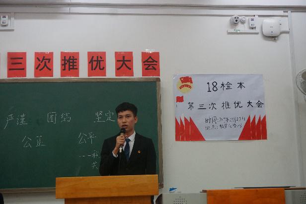 本次推优大会的9名推优对象,是团支部严格遵守推优的工作的相关规定与要求结合18检本学生管理手册中的相关内容选出的。大会在共青团的团歌中拉开帷幕,主持人方慧萍介绍推优细则,公布9名推优对象名单并对其进行简单介绍。紧接着,各推优对象依次介绍自己对党的认识并阐述了自己入党后的期望和努力目标,由团支部代表对推优对象进行评议。经过公平公正的投票表决之后,9名推优对象均顺利通过本次推优,成为入党积极分子中的一员。推优大会最后,胡友根对此次推优大会作出点评,他指出此次推优大会各项环节均符合相关规定,是一次严谨、团结、坚定、公正、公平的会议,但美中不足的地方是对于细节方面的把控还不够细致及严谨,对推优对象的评议中缺乏思想方面的评议,希望团支部能够在以后的工作中进一步改正。同时老师也肯定的说到这是一次非常成功的推优大会,树立优秀的榜样,也希望通过推优的积极分子能发挥带头作用,无论是学习还是工作中都应该发挥模范先锋作用,积极向党组织靠齐。