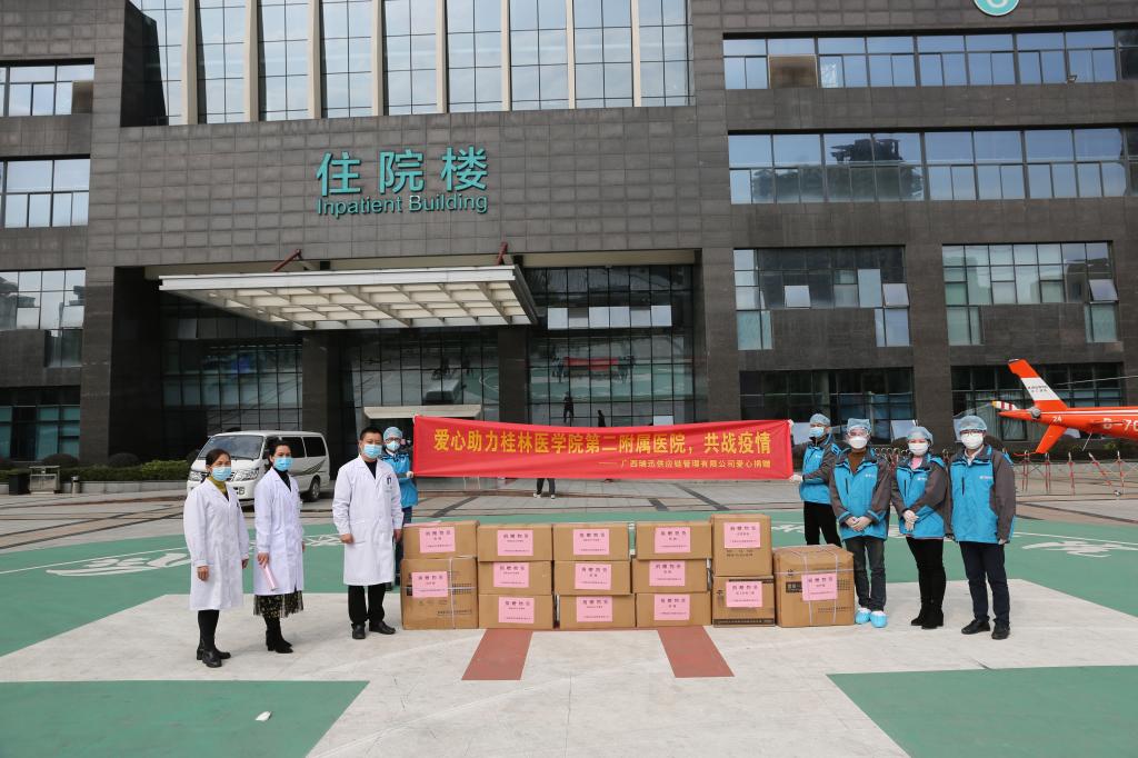 目前正值疫情防控的关键时期。2月13日下午,广西瑞讯供应链管理有限公司经多方委托,辗转购买了一批医用口罩、防护服、究竟、消毒液送来医院;优矿塑新材料科技(桂林)有限公司从日本购买了一批口罩;中国化工集团曙光橡胶工业研究设计院向医院赠来一批自产的隔离服送至医院。