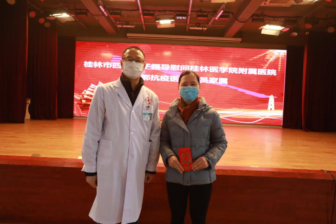 在慰问时,附属医院领导详细了解队员家属最近的生活状况,同时对不在桂林市的医疗队家属进行电话慰问,询问他们生活中遇到的困难,并及时给与解决。医院对为医疗队员做好后勤保障的家属表示衷心的感谢。同时希望家属们保重好自己的身体,在生活中,有需要、有困难及时和医院联系,大家携手共作援鄂医疗队的坚实后盾,让奋战在前线的队员没有后顾之忧,共同打赢这场疫情防控的阻击战!