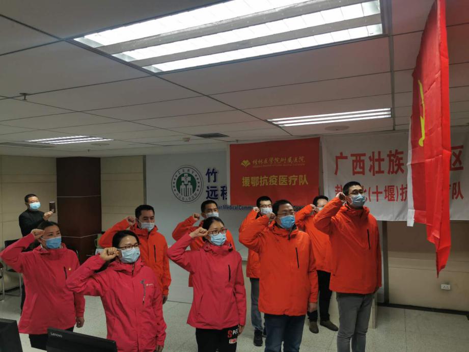 桂林医学院附属医院第二批援鄂抗疫临时党支部按照医院党委部署,在抗击疫情关键时期就地成立,由叶桂山同志任临时党支部书记,陈峰同志任临时党支部组织委员,廖春燕同志任临时党支部宣传委员。党支部一经成立,鲜红的党旗就在十堰市竹山县人民医院高高飘扬。