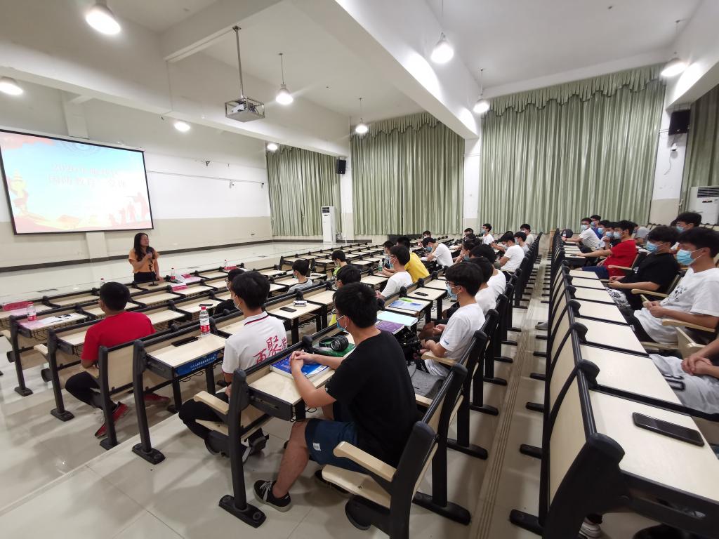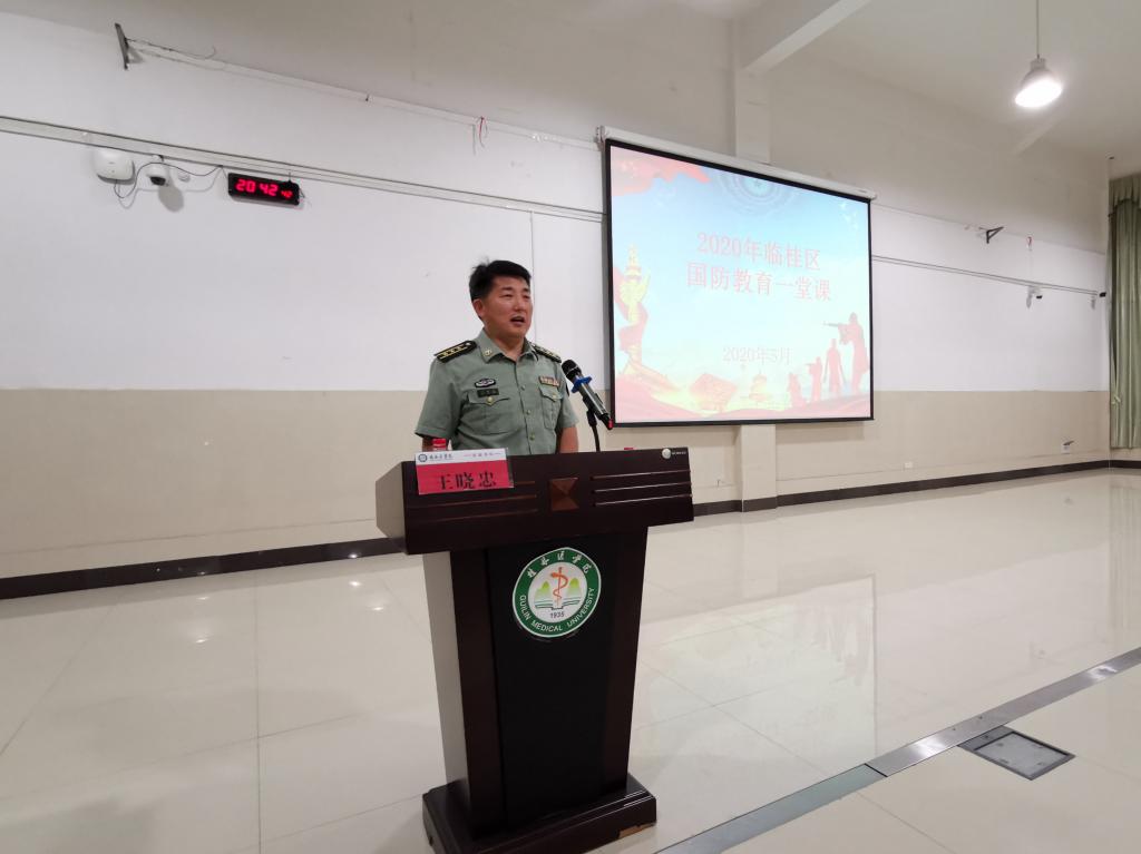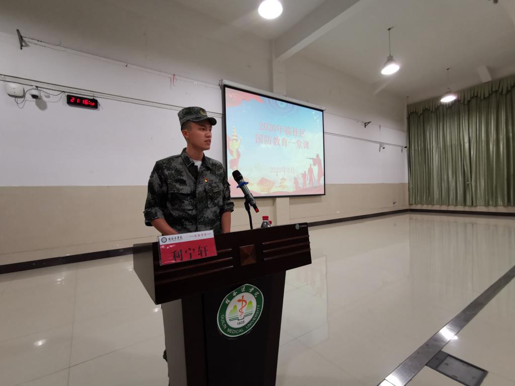 5月28日晚,由桂林医学院武装部、保卫处主办,口腔医学院、人文与管理学院和医学检验学院承办的国防教育一堂课在临桂校区多功能报告厅开讲。桂林市临桂区人民武装部政委王晓忠、桂林医学院武装部、保卫处处长冯天瑾、口腔医学院党总支副书记李媛、桂林市临桂区武装部政工科干事翟玉龙、口腔医学院沙远峰和人文与管理学院张心蕊老师以及优秀退役大学生代表利宁轩和卢丽妆出席,近200名男生参加活动。