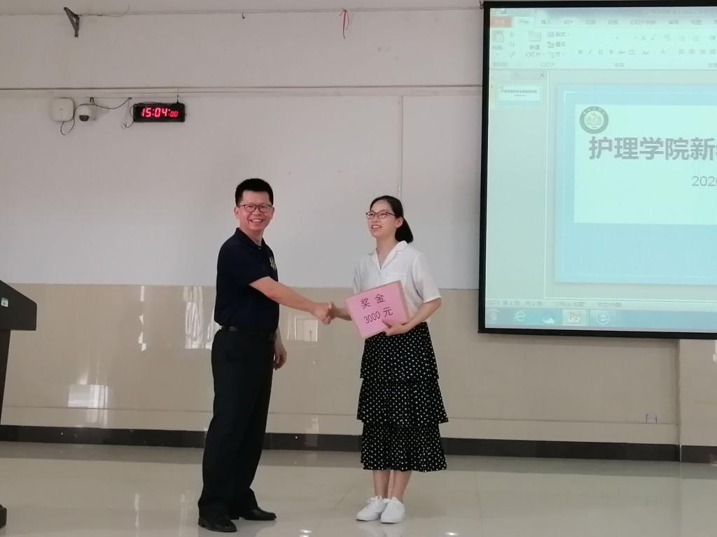 17高护四班田欣怡同学作为2020届毕业生代表,与同学们开展经验交流。田欣怡通过学校继续教育学院提供的便利,自考本科修完全部本科课程,拿到考研资格,现已被南华大学拟录取。为了表彰田欣怡积极进取的精神,鼓励更多的高职同学通过自考本科的方式提升学历,在交流会伊始,继续教育学院院长高东为田欣怡同学颁发了奖金三千元。