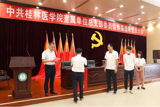 黄健同志代表中国共产党桂林医学院直属单位总支部委员会向大会作的报告共分三个部分:回顾过去工作成绩,对照初心找出差距,勇担使命狠抓落实。报告指出,直属党总支严格按照上级党委的指导和工作部署,认真完成党建各项工作任务,积极推动直属单位党建与教学业务工作深度融合,指导党支部围绕中心抓党建,抓好党建促发展,积极推进党支部在学校教学、科研、管理等各项工作中发挥政治核心作用。直属单位党员教师在学校的教育教学创新、人才培养质量、全国性全区性竞赛获奖、学科建设服务、校园文化建设、地方经济建设和社会服务等方面为学校的良好声誉增添了浓墨重彩的一笔。积极为学校“更大”“建博”努力奉献,助力提升学校的软实力。以上成绩的取得是学校党政的正确领导和直属单位全体党员干部努力拼搏的结果。报告强调,新一届直属党总支将继续在学校党委的正确领导下,以习近平新时代中国特色社会主义思想为指导,贯彻落实全面从严治党和党的十九大精神,紧紧围绕学校中心工作,以加强党的先进性、纯洁性建设为目标,努力做好直属单位政治建设、思想建设、组织建设、作风建设和纪律建设等,以考核党员在工作岗位中发挥作用,支部建设与部门工作深度融合为抓手,积极推进党建品牌建设,不断提高党组织的创造力、凝聚力和战斗力,努力为实现学校“建博”和“更大”目标发挥政治核心作用。