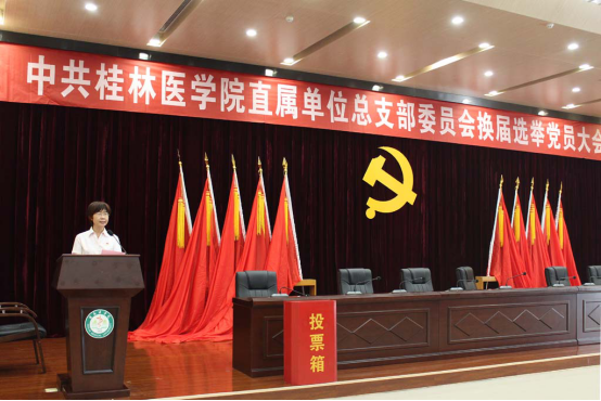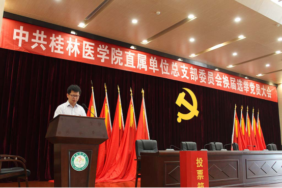 直属党总支黄健书记代表中共桂林医学院直属单位总支部上一届委员会作了题为《不忘初心开拓进取,牢记使命锐意创新,积极开创直属单位团结和谐稳定进步新局面》的工作报告。直属党总支蒋海萍副书记主持会议。直属党总支纪检委员高东同志致开幕词。直属党总支全体共产党员出席会议。直属单位各部门党外中层干部和分工会主席作为特邀嘉宾列席会议。