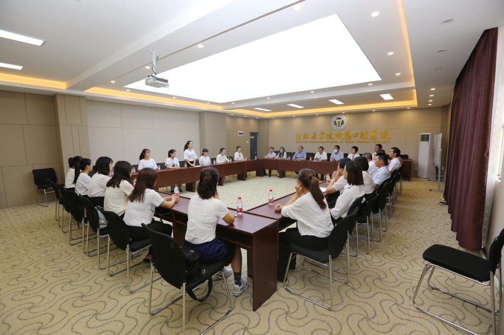 盛夏时节,万物生长,时光正好,筑梦前行。正值附属口腔医院建院庆4周年之际,8月16日,医院隆重举行2020年新员工入职仪式,热烈欢迎新入职的16名同志加入附属口腔医院大家庭。医院领导班子成员、全体中层干部、新入职员工参加了座谈会,会议由副院长陆梅主持。