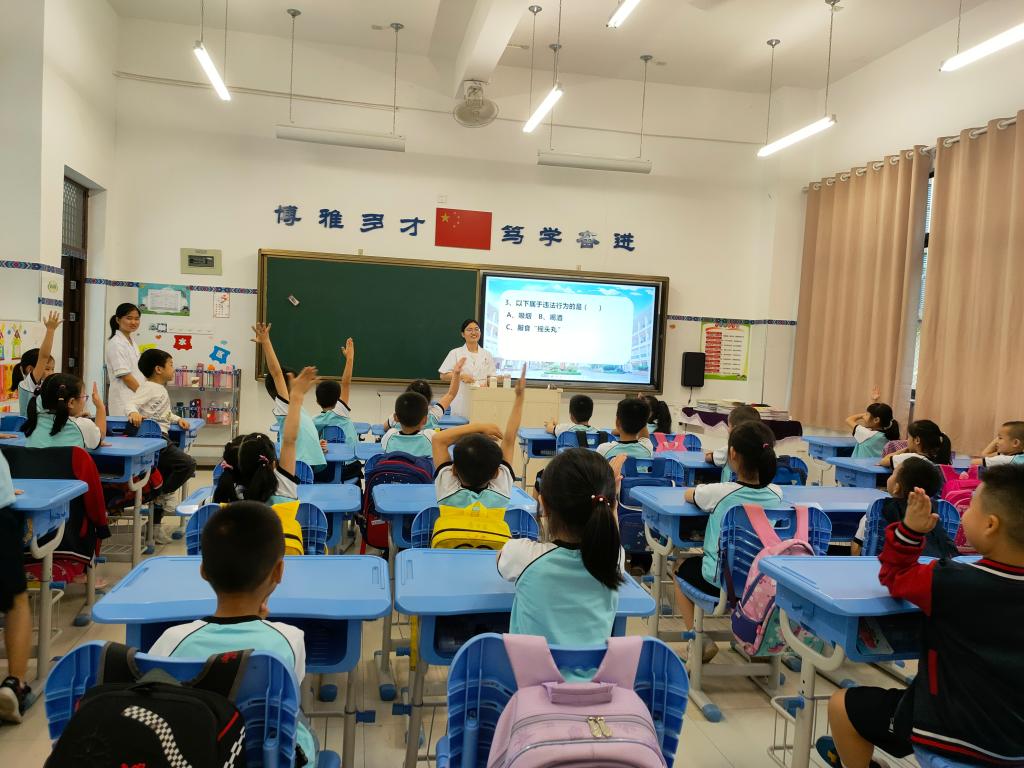 活动中,学生志愿者给博元小学幼儿班至五年级共20个班进行健康知识宣讲。志愿者通过多媒体课件教学、播放视频等方式,向同学们介绍了毒品的种类、吸毒的表现及危害等知识,告诫同学们要珍爱生命,拒绝毒品的诱惑。课堂上,同学们认真听讲,主动提问,在有奖问答和游戏互动环节积极举手,踊跃回答,巩固和深化了所学知识,整场气氛融洽和谐。