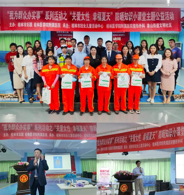 炎炎夏日,防晒护肤是女性朋友出行必做的事,为此,桂林医学院附属医院烧伤创面修复整形外科、医学美容外科联合桂林市妇联,于“护肤日”当天下午,在桂林市妇女儿童活动中心举办了主题为“关爱女性,幸福夏天”的防晒知识公益讲座,科主任龚振宇和刘阳博士为市妇联工作人员、女教师、女警察、女环卫工人等女性同胞讲授了防晒知识,帮助她们完美度夏。