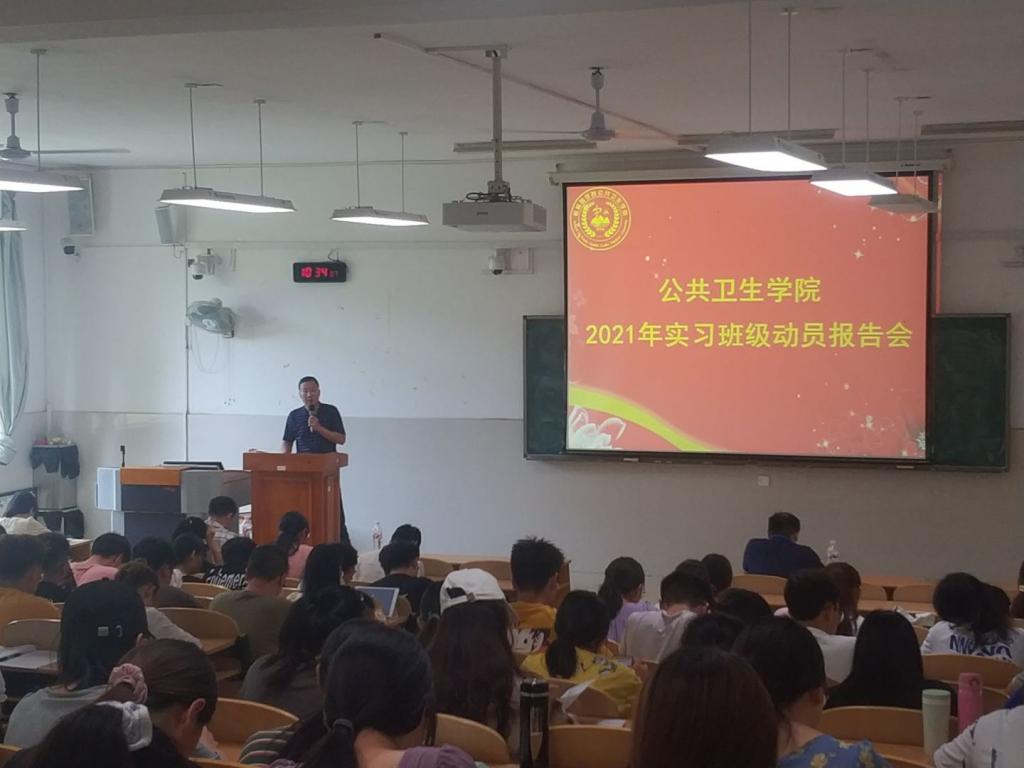 实习是医学人才培养的一个重要环节,是学生对所学知识和技能进行实践运用、总结和深化的重要过程。为进一步做好我院学生下点实习工作,推进实习工作的顺利开展,公共卫生学院于7月5日上午在教学南楼S103举行2021年度教育实习动员会,公共卫生学院党委书记、院长谭盛葵,副书记庞伟毅,副院长曾怀才出席会议并讲话,教学管理科负责人、各实习班级辅导员、2021年全体实习生参加会议。