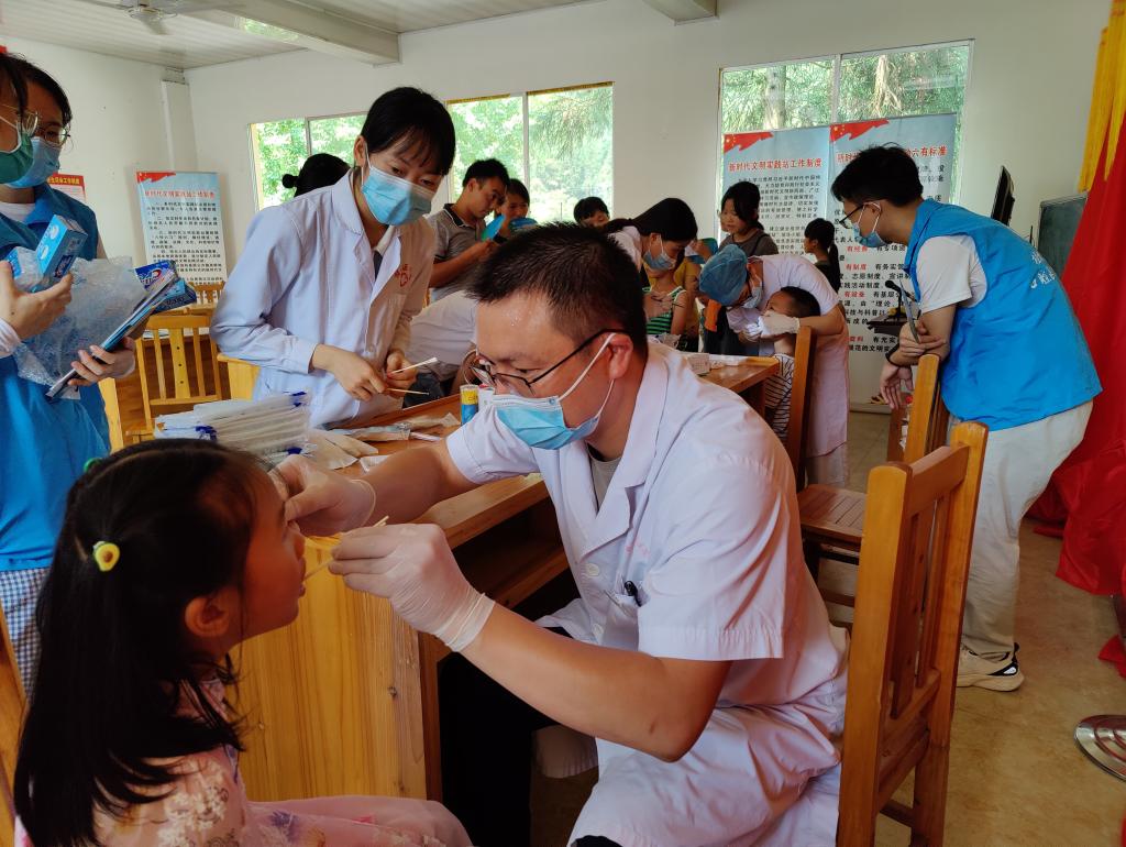 义诊活动现场,前来咨询、问诊的群众络绎不绝,志愿者们为当地群众进行血压、血糖和心跳等常规检查并引导分诊。全科医生开展健康咨询、科普医学常识等服务,耐心地解答村民们提出的各类问题,结合常见疾病现场开展宣教,让村民们掌握健康生活常识和防病知识。口腔医生结合2021年“全国爱牙日”主题,通过现场授课、牙模演示和发放口腔保健宣传册为群众普及科学的刷牙方式,开展口腔检查及为适龄儿童进行免费涂氟。活动过程中,医护人员和志愿者还慰问了当地困难群众并送上温暖与祝福。