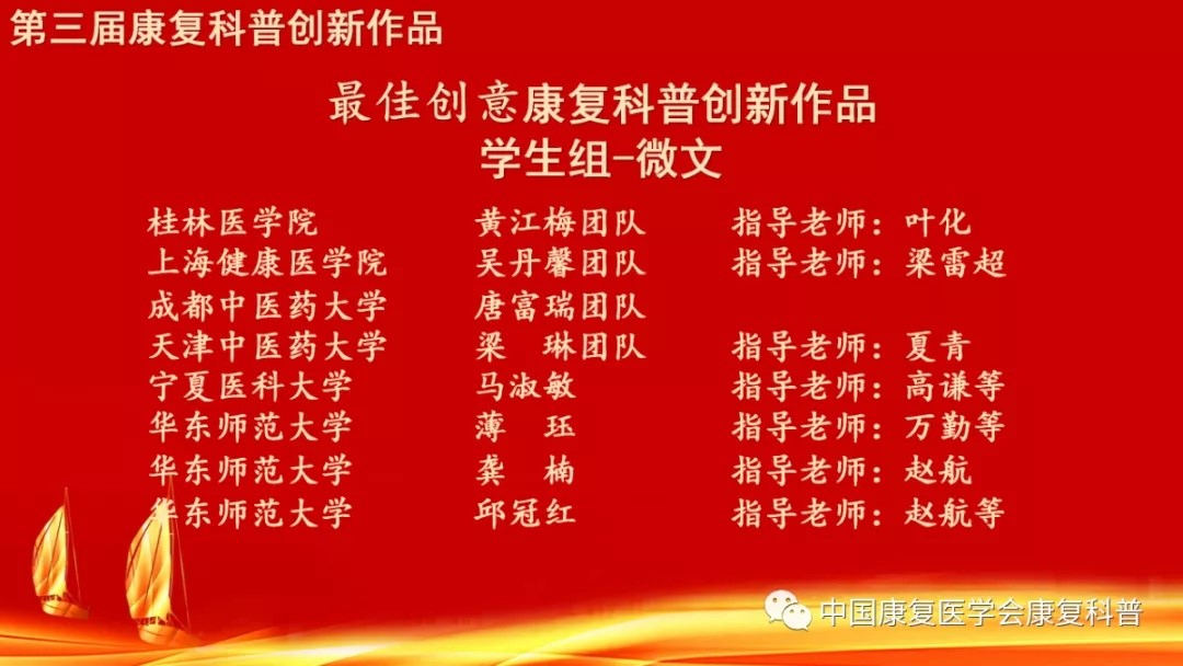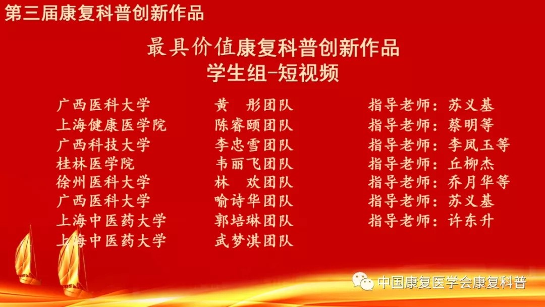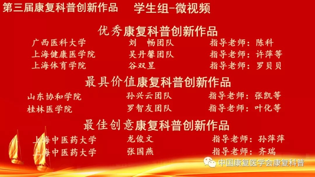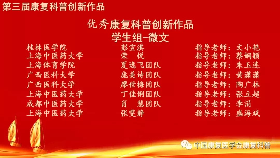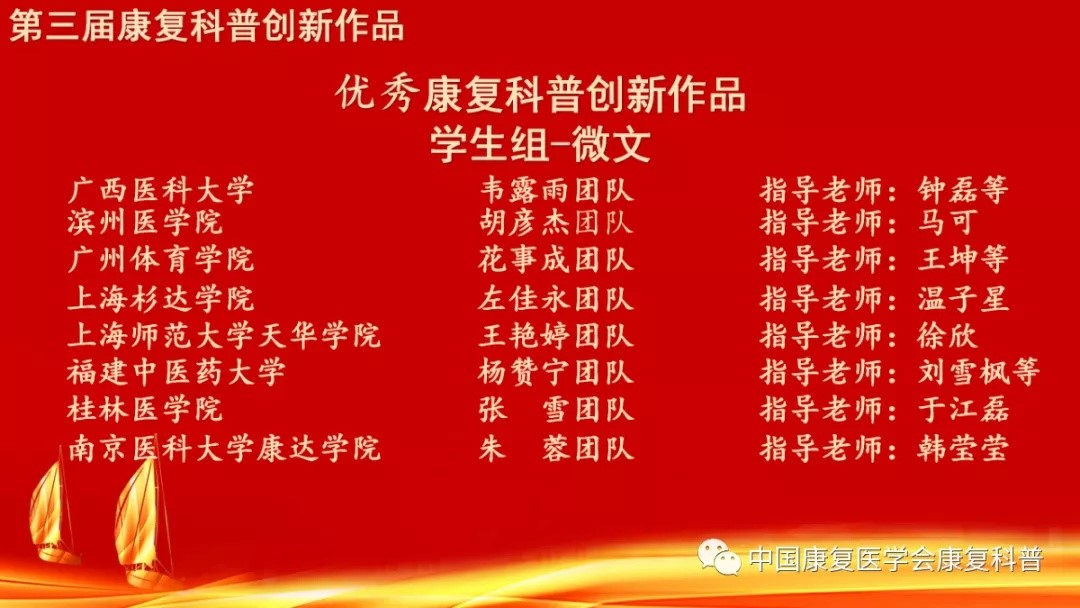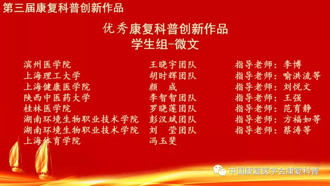 “第三届康复科普创新作品大赛” 决赛采取线上线下融合办会模式。我系6个学生团队分别参与学生组微视频、短视频和微文作品大赛。罗智友团队的微视频《30s带你了解“妈妈手”》、韦丽飞团队的短视频《及时止“损”——腰肌无负担》获评“最具价值康复科普创新作品”;黄江梅团队的微文《警惕!原来娃的这种行为就是“感统失调”》获评“最佳创意康复科普创新作品”;罗晓莲团队的微文《崴脚 POLICE来帮忙!》、张雪团队的微文《健康生活,拒做“低头族”》、彭宣淇的微文《不被重视的“手机手”,痛起来要命!》获评“优秀康复科普创新作品”。视频生动形象,文字通俗易懂,科普乐趣浓郁,帮助更多的人了解康复,做到早发现、早治疗。