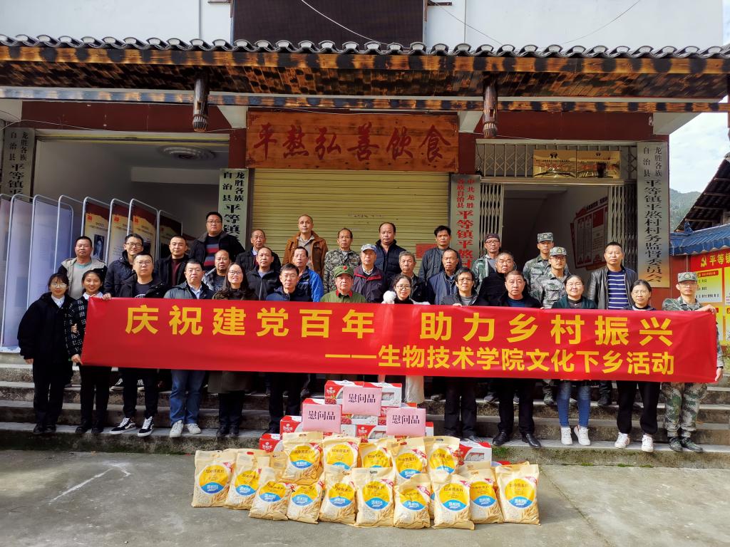 为响应桂林医学院统一战线助力乡村振兴主题实践行动的号召,11月23日,在建党百年、龙胜各族自治县成立70周年之际,生物技术学院党委组织学院领导班子、党委委员、党支部书记、民主党派、退役复学学生、党员和入党积极分子代表一行15人前往结对帮扶的龙胜县平等镇平熬村,开展以“庆祝建党百年助力乡村振兴”为主题的文化下乡暨慰问革命老兵活动,为退役老兵送去关心和温暖,引导广大师生继承和弘扬老兵们的革命精神和高尚品格,从中国共产党人的精神谱系中汲取智慧和力量,以实际行动传承红色文化,助力乡村振兴。驻村第一书记范桂珲及村委负责人、平熬村退伍老兵参加了本次活动。