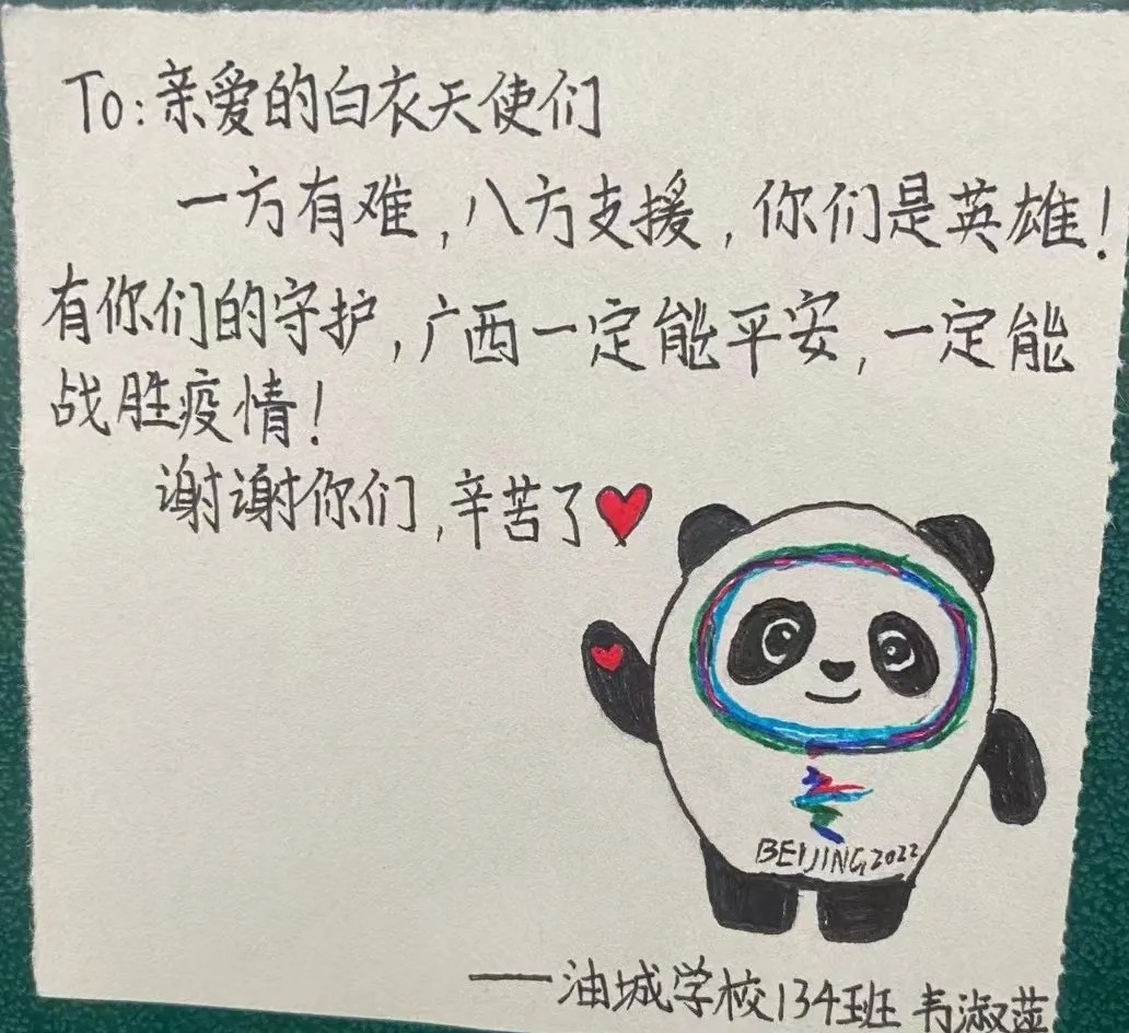 百色是一座红色之城,更是一座温暖之城。第二附属医院医疗队在完成核酸采样后,百色小学童声合唱、绘画致谢医院白衣天使。“听我说谢谢你,因为有你,温暖了四季,谢谢你,感谢有你,世界更美丽……”居民们为队员们送去头一天夜里包好的热气腾腾的粽子。住宿的酒店还为医疗队员们精心准备了蛋糕和鲜花。