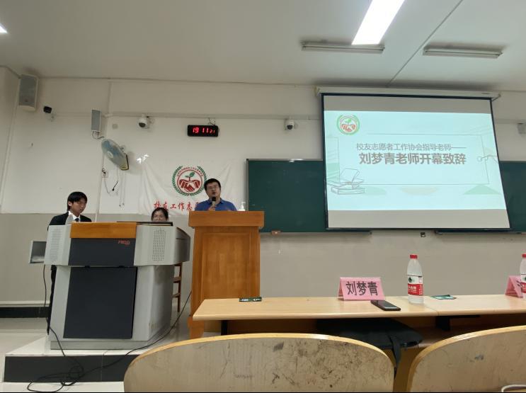 刘梦青作开幕致辞,他对校友工作志愿者协会一年来做出的大量工作表示肯定,对广大成员的辛勤付出表示感谢,并对同学们深切寄语:一是要弘扬志愿精神,做好校友服务;二是要厚植感恩情怀,心系学校发展;三是要珍惜与校友学习交流的机会,在服务中增长本领,在对标中提升自我。