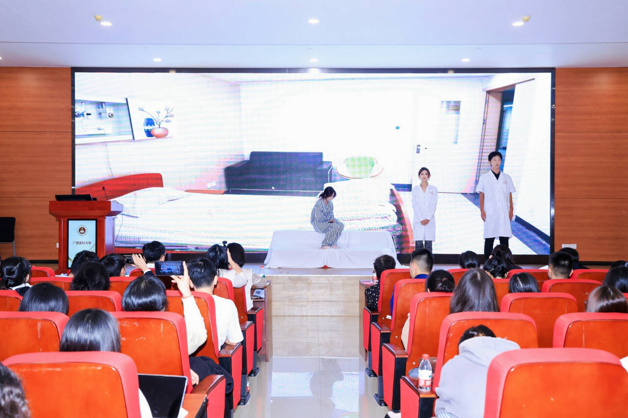 10月31日晚,桂林医科大学第二临床医学院师生代表受邀参加“提升医学人文关怀我们在行动暨第五届构建医患命运共同体”学术研讨会,并在广西医科大学卓越楼21楼学术报告厅的“论坛一:医学生论坛”分会场演出原创情景剧《顶楼》。