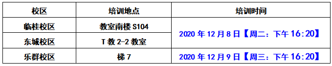 我校分别在东城校区、乐群校区和临桂校区举行考务培训会,请全体监考老师务必按时到会,如有教学任务不能参加培训的监考老师,必须以二级学院为单位交书面申请,并于培训前交教务处考试中心备查。具体时间和地点如下: