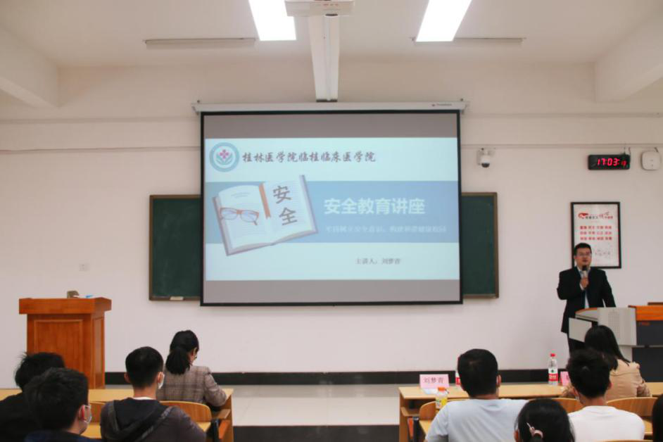 在开学第一课上,师生共同观看了桂林医学院第二附属医院为国庆献礼的快闪视频。刘梦青进一步给同学们介绍二附院的发展历程,医疗资源、临床教学资源等,随后,用考研率、就业率等客观数据,向同学们介绍了学院的教学情况和成果。同时,就新生开学安全问题进行了“牢固树立安全意识,构建和谐健康校园”主题安全教育讲座。他提醒同学们注意食品安全,并从同学们最容易经历诈骗方面切入,用幽默轻快的言语、亲身经历的故事向同学们传授防范电信网络诈骗的“小密招”,提高同学们的安全防患以及自我保护意识。
