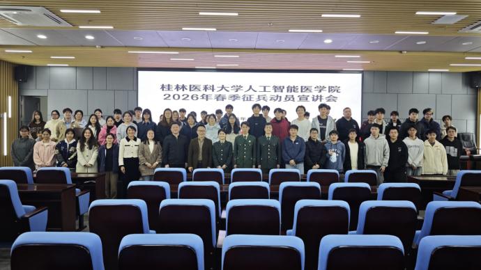 12月9日晚,人工智能医学院在科学实验中心报告厅开展了2026年春季征兵动员宣讲活动。学院党政领导代表、全体辅导员、班主任代表、退役复学大学生代表,以及线上线下学生、家长代表近200人参加。