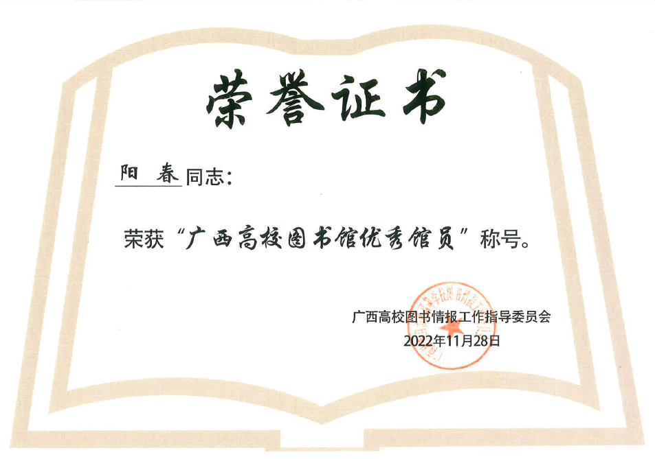 据悉,来自全区共有43所高校的26位馆长、67位馆员参与评审,我校图书馆阳春同志荣获广西高校图书馆“优秀馆员”称号。此次评选,旨在树立典型、表彰先进,进一步激励全区各高校图书馆馆员立足岗位、担当作为,为进一步提升我校图书馆的良好声誉开启新篇章。