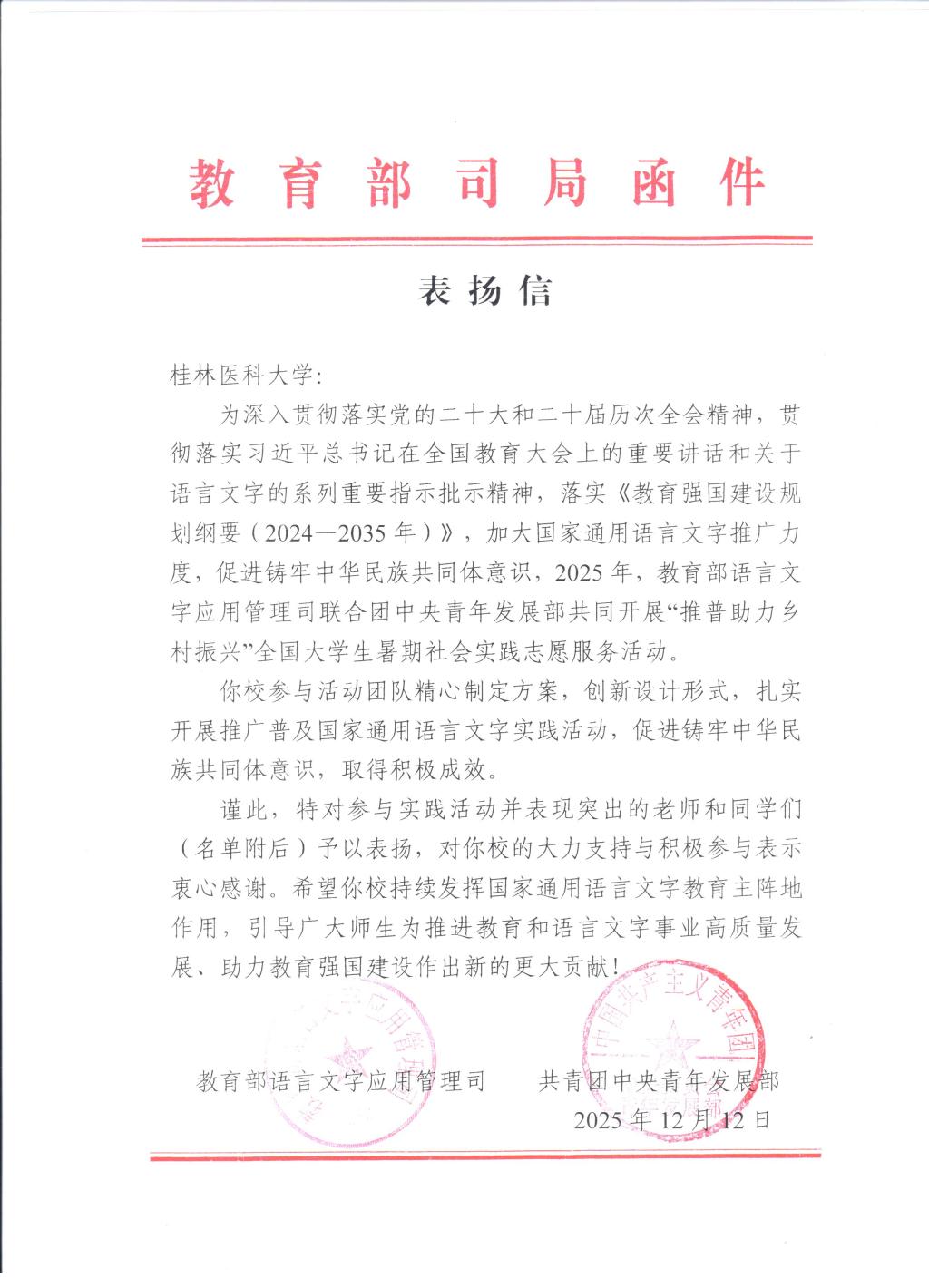 教育部与团中央在表扬信中高度认可我校团队“精心制定方案,创新设计形式,扎实开展实践活动,取得积极成效”,并对学校的组织支持与师生的积极参与表示衷心感谢,希望学校继续发挥语言文字教育主阵地作用,为教育强国建设贡献更大力量。此次表扬是对我校持续推进实践育人、深化“大思政课”建设成效的充分肯定。学校将继续鼓励和支持青年学子投身社会实践,将专业知识与时代需求相结合,持续深化“三下乡”社会实践长效机制,推动更多青年在服务乡村、贡献社会的过程中增长才干、实现价值,为全面推进乡村振兴、铸牢中华民族共同体意识持续注入青春动能。