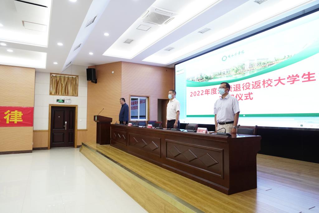 11月4日下午,我校在临桂校区明德楼101多功能报告厅举行2022年度光荣退役返校大学生欢迎仪式。学校党委常委、副校长、征兵工作领导小组副组长辛懋,校征兵工作领导小组成员、征兵工作站全体人员、2022年退役复学大学生、退役复学大学生所在班级辅导员及部分学生代表参加仪式。仪式由武装部负责人主持。