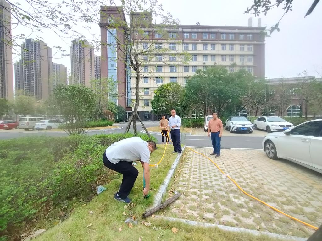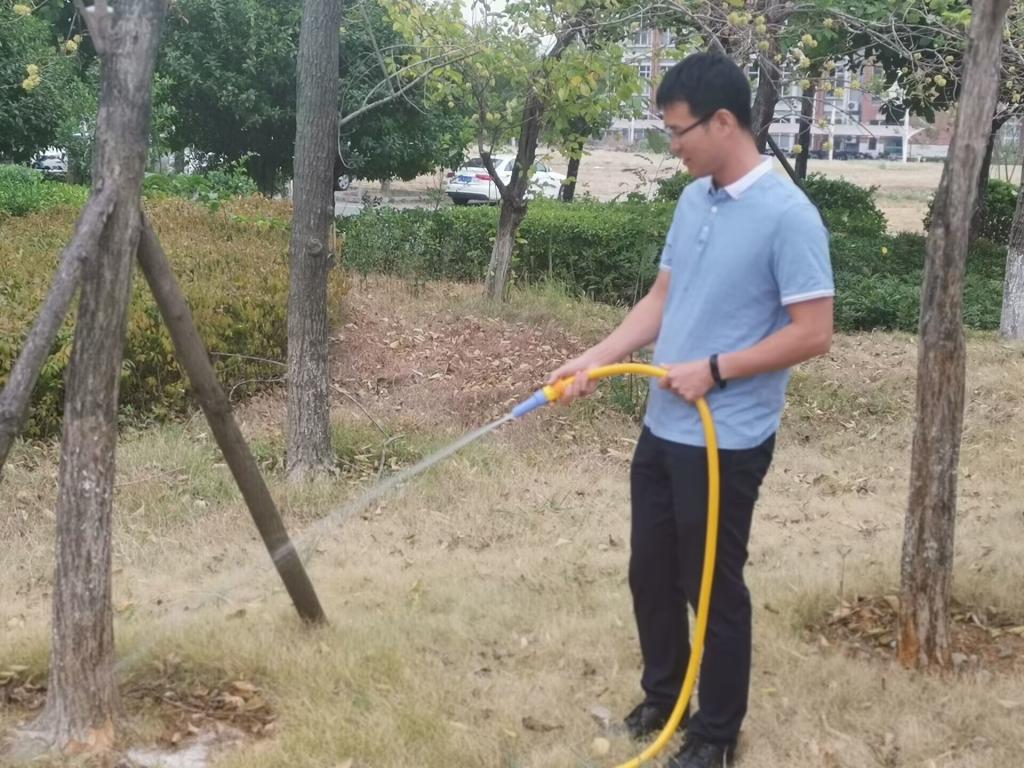 党员们搬来水管、接好水源开始对绿植进行浇灌,大家各司其职,紧密配合,干劲十足,展现出不怕苦、不怕累的昂扬精神面貌,用实际行动守护校园绿色。