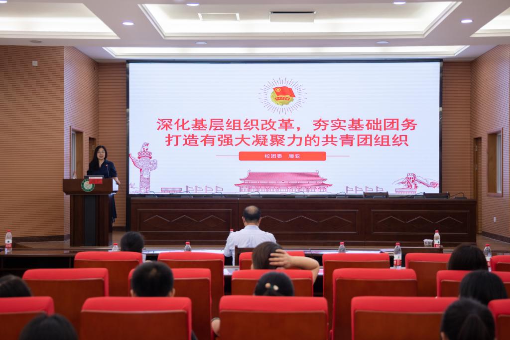 校团委书记滕亚以深化基层组织改革,夯实基础团务,打造有强大凝聚力的共青团组织为主题,从共青团的定位和基层组织,团支部基本工作及团员的发展,相关文件的解读和学习等方面,全面介绍了共青团基层组织的各项工作。研究生工作部副部长余想远作从国家奖学金、国家助学金、卓越奖学金、学业奖学金、校长奖学金、三助(助教、助研、助管)以及困难补助等七个方面进行了解读。