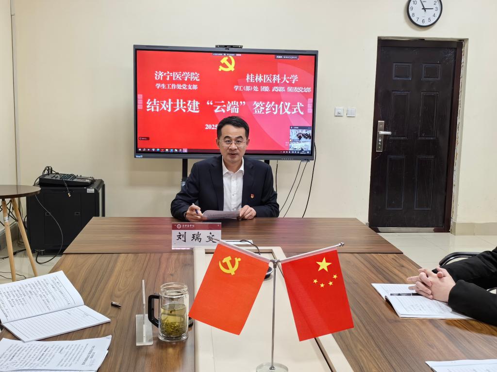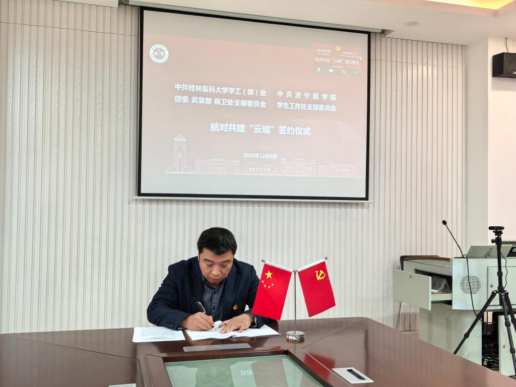 2025年12月9日下午,桂林医科大学机关党委学工处团委武装部保卫处党支部与中共济宁医学院学生工作处党支部以线上形式联合开展主题党日活动,并签署结对共建协议,标志着两校在学生工作领域的深度合作正式启动。