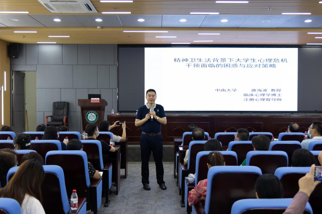 1天的讲座分为“精神卫生法背景下大学生心理危机干预面临的困惑与应对策略”及“大学生自杀高危人群的识别与干预技术”两个专题。上午,唐海波紧密围绕《中华人民共和国精神卫生法》相关条例,结合高校学生心理危机干预典型案例,详细阐述了如何法律范围内做好学生心理危机的干预、转介、休学、家校沟通、校医联合等工作。下午,唐海波结合自身工作经验,详细讲解“自杀概念”“自杀8个因素”“自杀应急-素质模型”“自杀识别方法”四个方面内容。